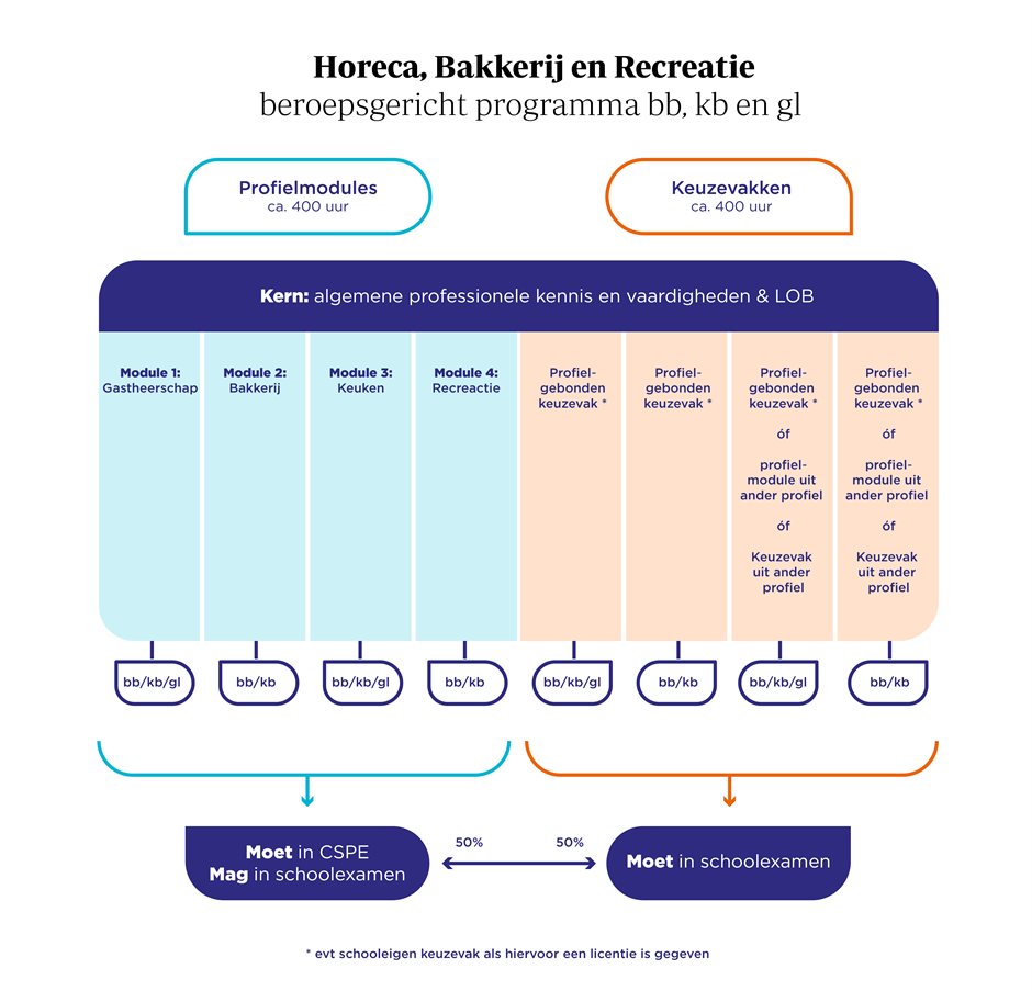 De profielmodulen van het beroepsgerichte programma Horeca, Bakkerij en Recreatie worden afgesloten met een combinatie van het schoolexamen (SE) en het centraal schriftelijk en praktisch examen (CSPE). De keuzevakken die leerlingen volgen, worden afgesloten middels een schoolexamen (SE).